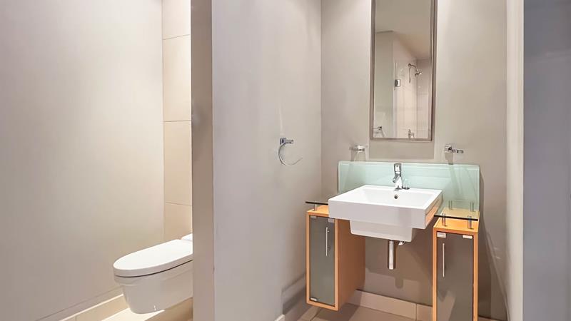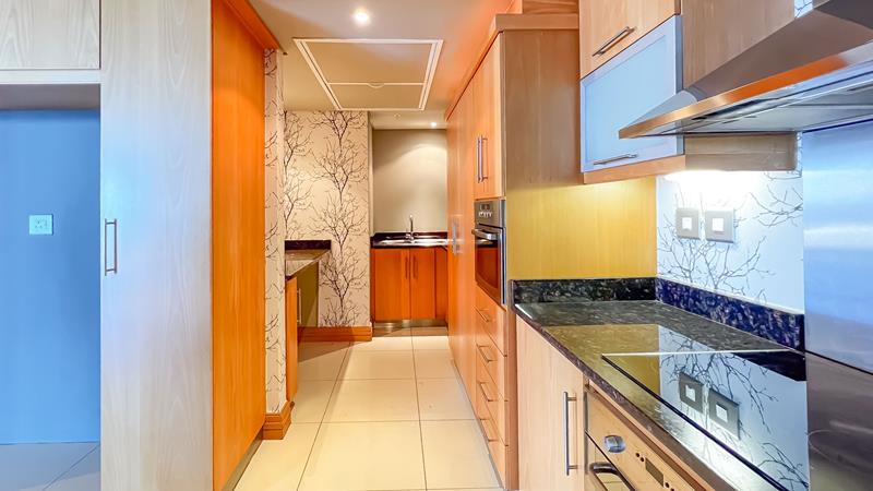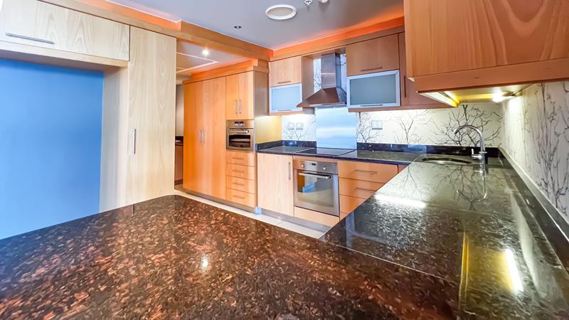 The kitchen is both stylish and functional, equipped with all essential appliances and ample space for a double fridge. It is an ideal setting for culinary enthusiasts or anyone who enjoys cooking.