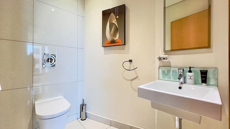 The lavish en-suite bedroom offers a sanctuary of tranquillity, featuring a plush bed, generous closet space, and contemporary fittings. A well-appointed guest bathroom adds convenience, ensuring an exceptional living experience for both residents and visitors.